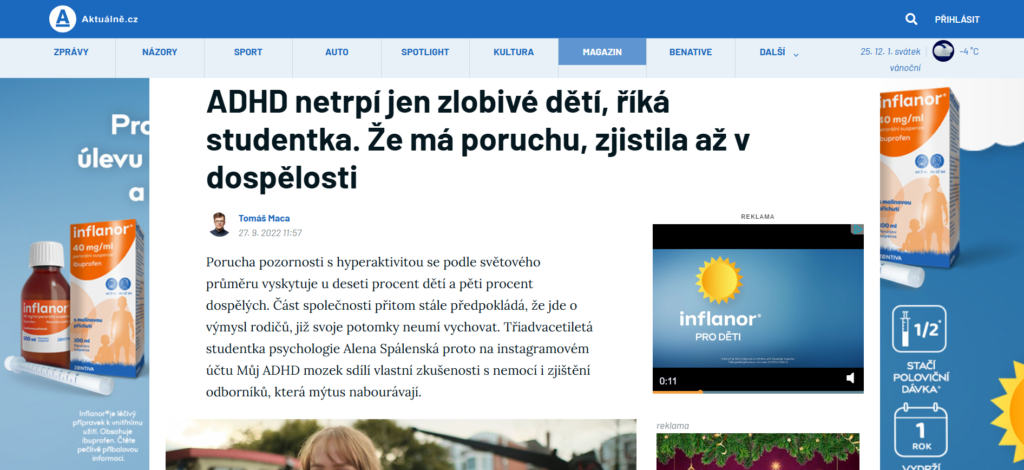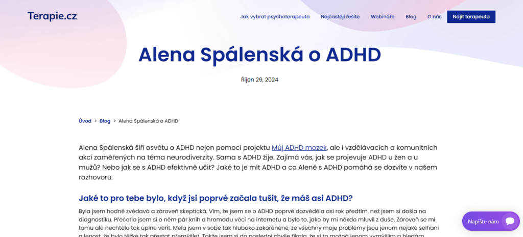 Jmenuji se Bc. et Bc. Alena Spálenská. Jsem psycholožka, koučka, krizová interventka a frekventantka psychoterapeutického výcviku a ve své práci se specializuji na ADHD. O poruše pozornosti přednáším a šířím osvětu na svém instagramovém účtu @muj_adhd_mozek.